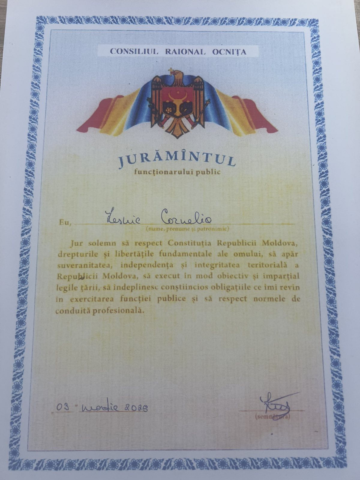 În legătură cu expirarea perioadei de probă, în conformitate cu art. 31 alin. 5 a), 32 din Legea nr. 158 din 04.07.2008 cu privire la funcția publică și statutul funcționarului public, a fost confirmată, prin Dispoziția președintelui raionului nr. 83-p din 04 martie a anului în curs, în funcție publică dna Lesnic Cornelia, specialistă superioară în Serviciul de consultanță în agricultură și economie din cadrul Direcției de dezvoltare a sectorului agrar, economic, funciar al Consiliului raional Ocnița. La data de 09 martie 2026, în prezența Președintelui raionului dlui Plopa Iurie, colegilor de serviciu și în fața simbolurilor de stat, dna Lesnic Cornelia a depus Jurământul de credință.