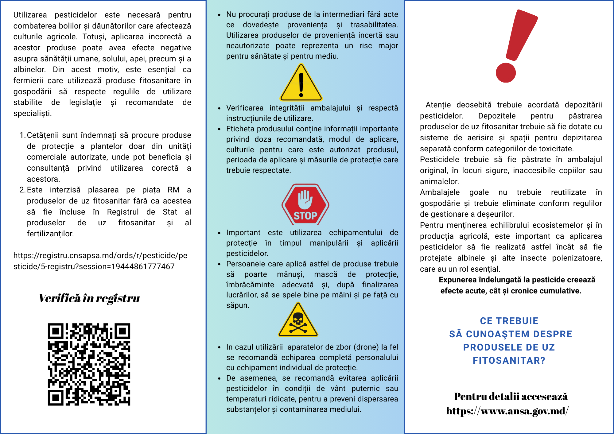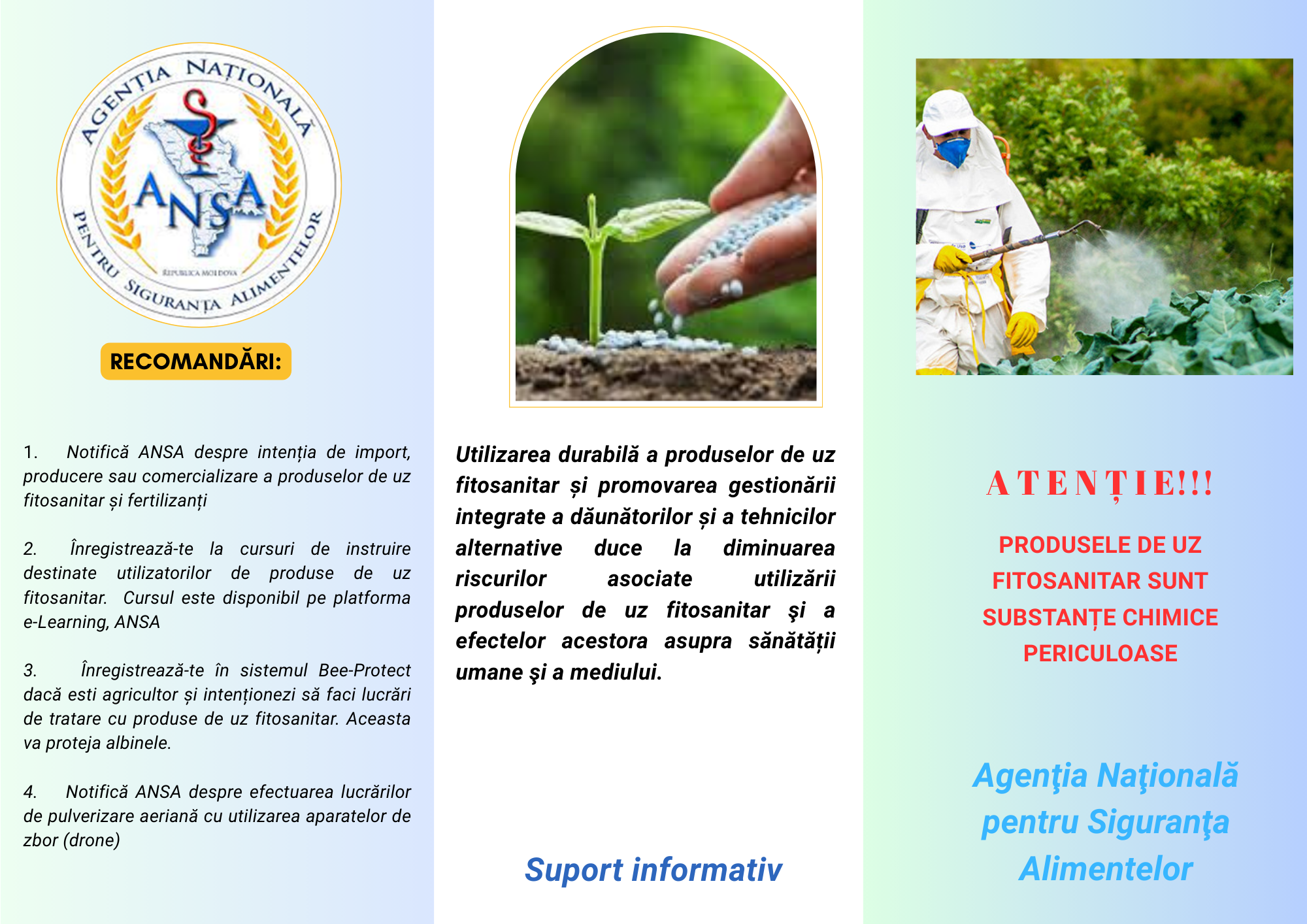 - ✔ Informarea și responsabilizarea utilizatorilor cu privire la utilizarea corectă și sigură a produselor de uz fitosanitar;